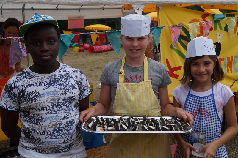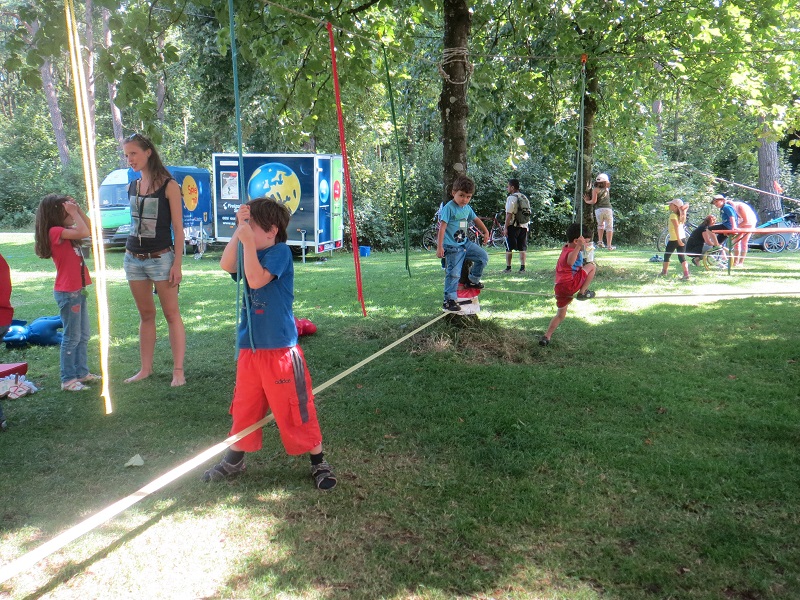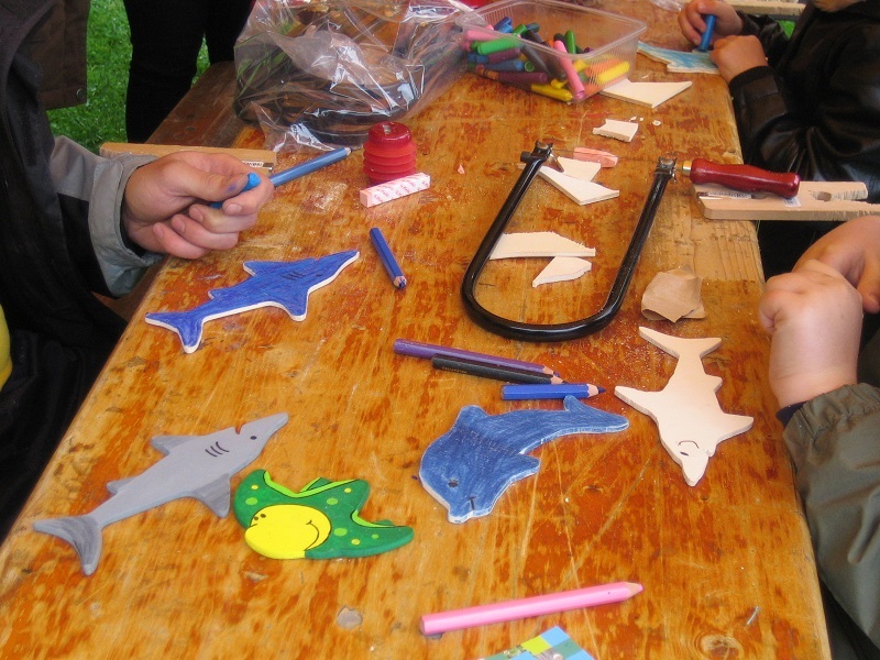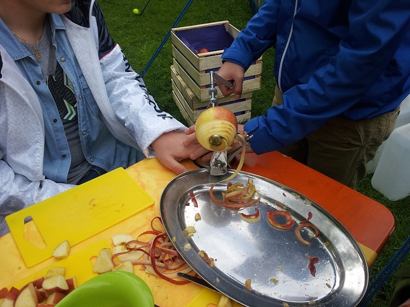 Wegen dem Regen mussten einige in das große Zelt umziehen. Dort konnte man zum Beispiel tolle Holzjojos selbst basteln oder Äpfel schälen und gleichzeitig in