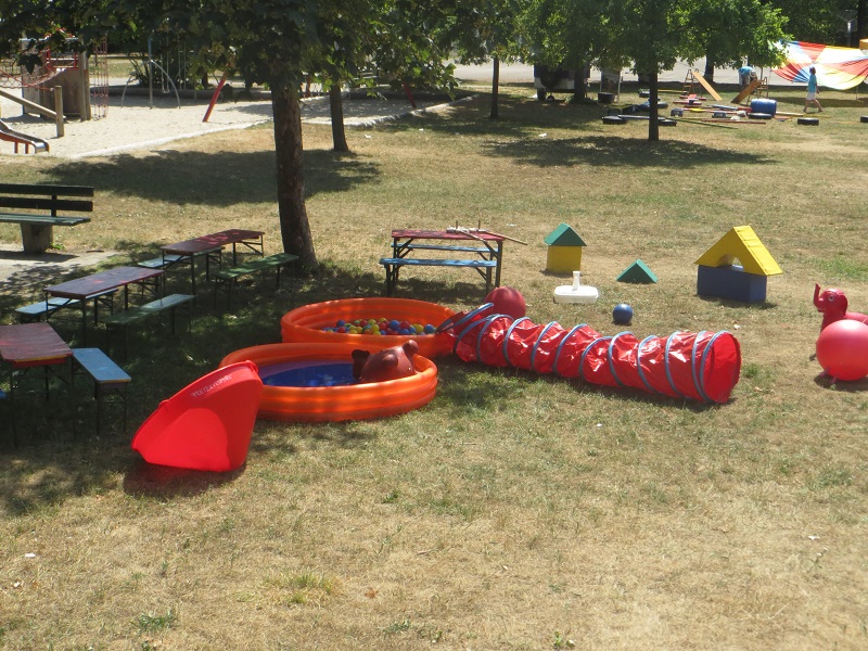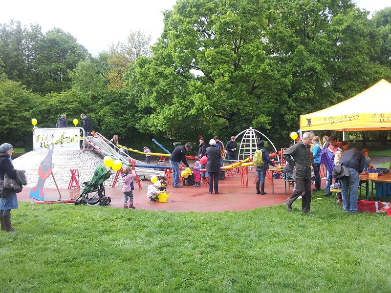 Passend zum feuchten Wetter war besonders die Wasserbaustelle beliebt. Durch die vielen bunten Röhren konnte das Wasser fließen oder Bälle um die Wette rollen. Hier