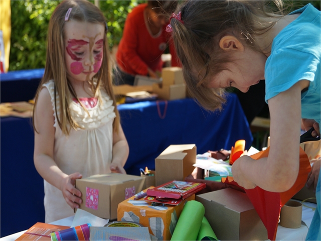 KIDS-Online Reporter Navid interviewt: Beim Stand der Kinderbeauftragten konnte man eine Schatzkiste bauen und mit eigenen Schätzen oder mit selbst gebastelten Spielsachen vom Spielfest füllen.