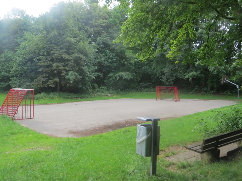 Der Bolzplatz ist geteert und hat zwei Tore. Er ist umgeben von viel Natur und von einem hohen Gitter, damit der Ball nicht davon fliegen