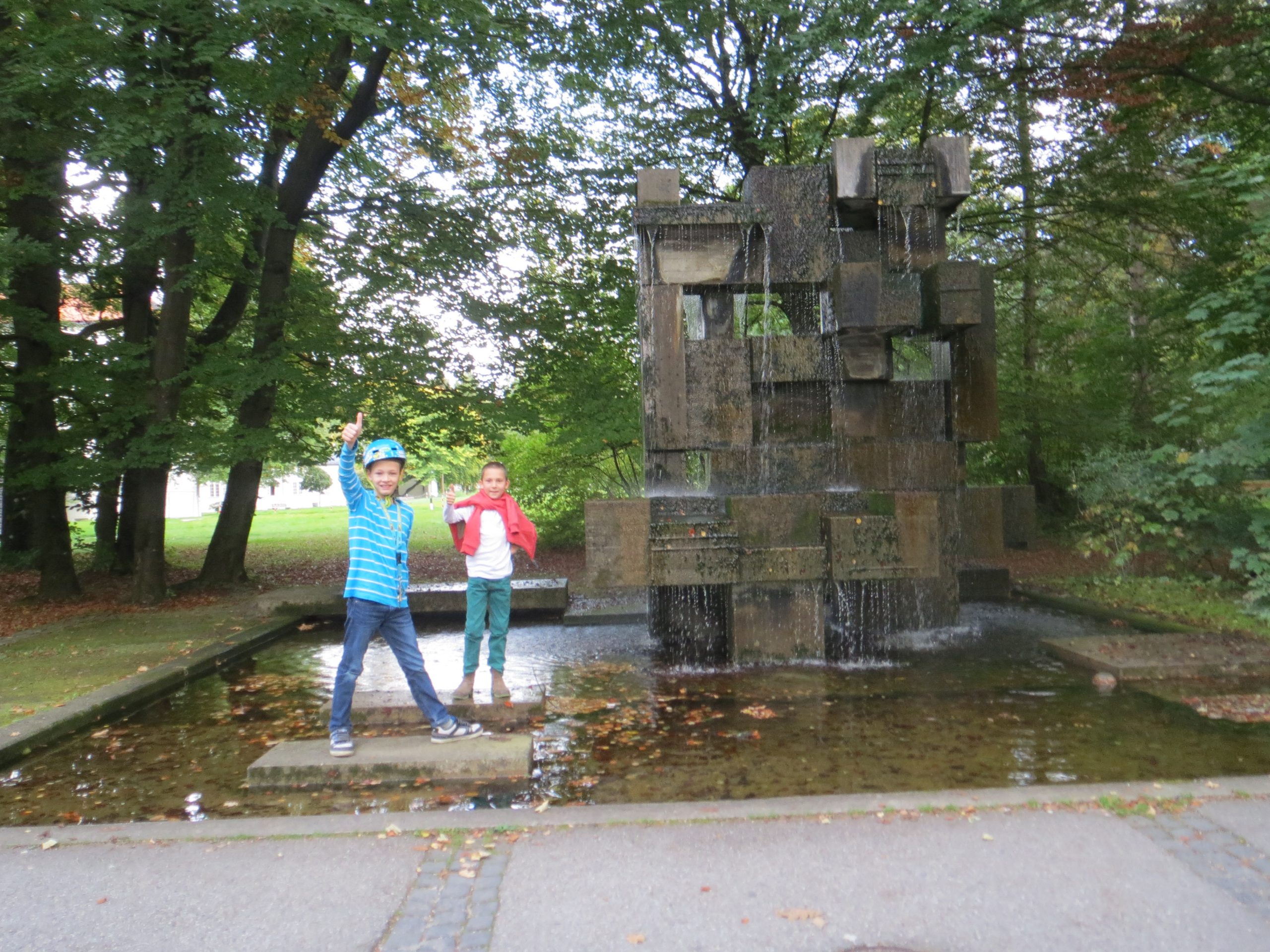 Unsere Forscher haben einen tollen Brunnen mit langem Wasserlauf oberhalb vom Mollsee im Westpark entdeckt. Der Brunnen selbst hat 6 Düsen, aus denen das Wasser