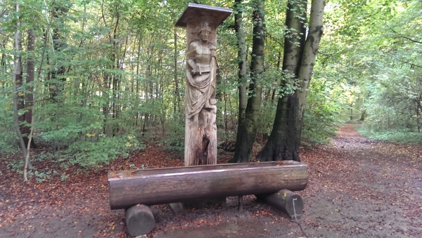Der Brunnen ist im Wald an der Isar, in der Nähe von der Großhesseloher Brücke. Die Eichenfigur stellt den Heiligen Martin dar.