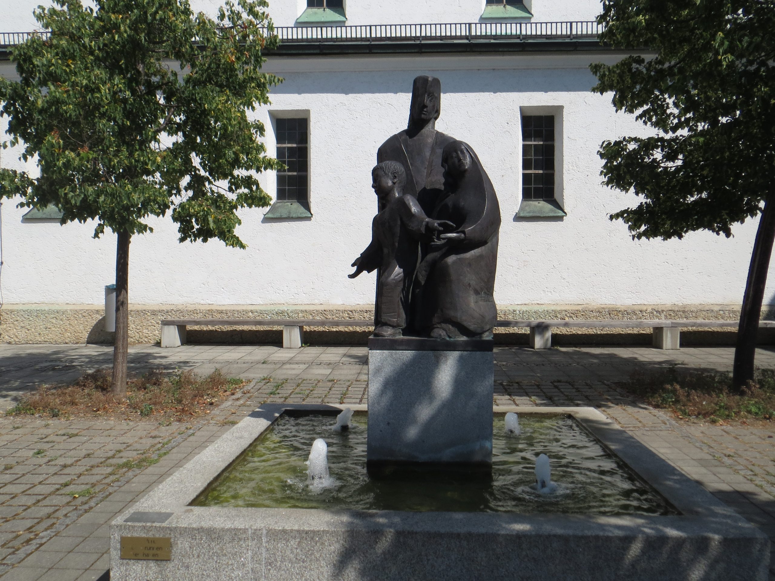 Maximilian-Kolbeallee, vor der Kirche Der Brunnenrand ist breit genug, dass du entlang balancieren könntest. Übrigens, früher sahen viele Brunnen so aus, aus denen die Münchner
