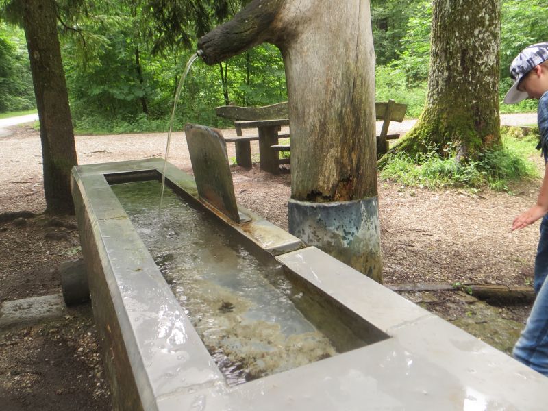 Das Wasser fließt von einem kleinen Steinbecken in ein größeres, in dem auch Hunde gerne mal baden gehen. Der Brunnen eignet sich super zum Schiffchen
