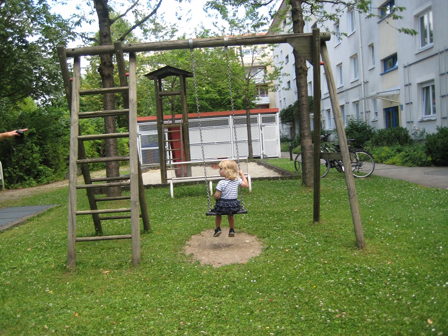Hier hat Ilona (4) einen kleinen netten Spielplatz entdeckt. Es gibt einen Kletterturm, Schaukeln, und einen Sandkasten für die Kinder, die in der Nähe wohnen.