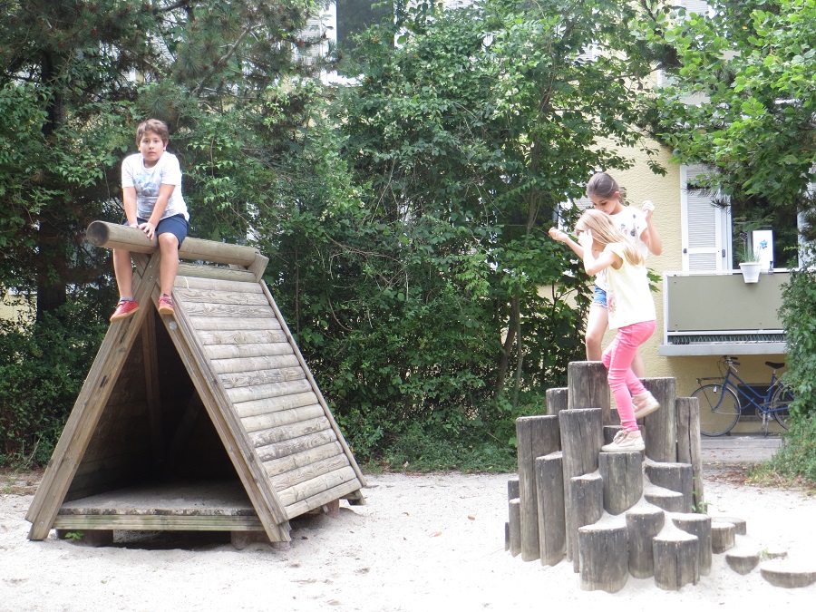 Ihr findet Wipptiere und eine Holzpyramide inmitten der umstehenden Wohngebäude. Dadurch seid ihr vor Autos geschützt und könnt ungestört spielen.