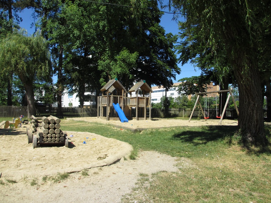 Dieser Spielplatz ist auch für die Kinder gedacht, die dort in der Nähe wohnen, deshalb ist er eingezäunt. Du findest hier eine Wippe, einen Sandkasten,