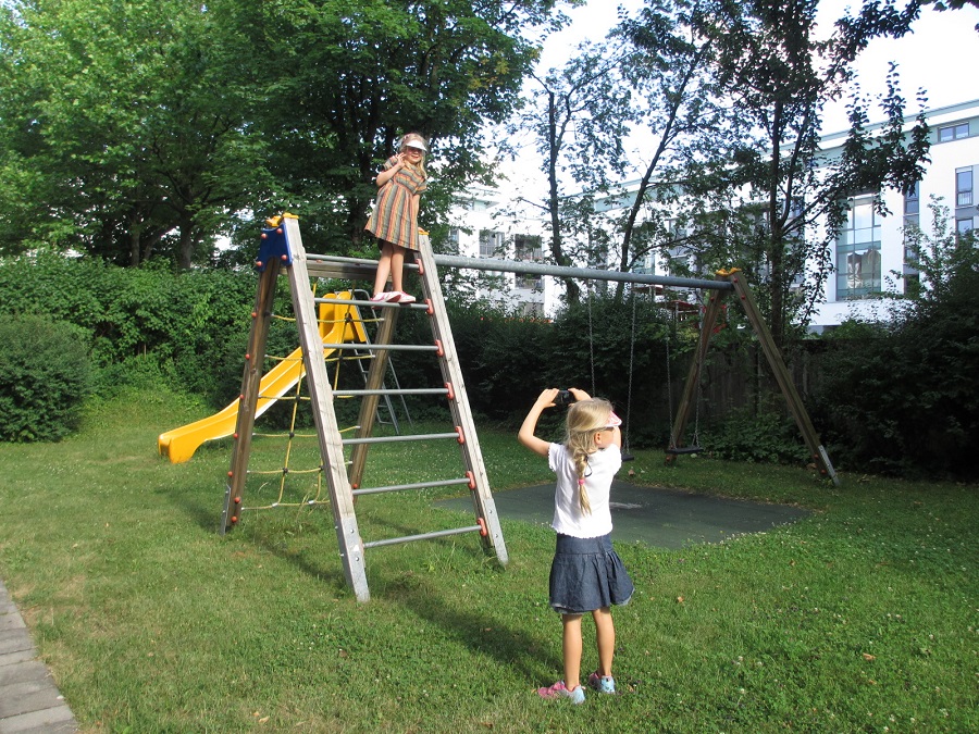 Der Spielplatz mit Kletterhaus, Nestschaukel und Feuerwehrstange befindet sich hinter dem Haus in der Steinhauserstr. 48. Er gefiel den Forschern besonders gut.