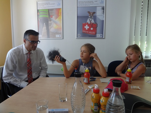 Unsere Forscherinnen Mirabell (10) und Marleen (8) trafen Herrn Frank und Frau Dobmeier, die für eine Firma arbeiten, die Spielplätze prüfen: die ias health & safety.