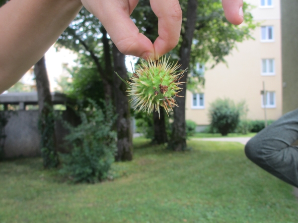 An der Ecke zur Alpspitzstraße hat Aaron (9) einen Kastanienbaum entdeckt. Die Kastanien sind noch „eingepackt“ und daher etwas stachelig.
