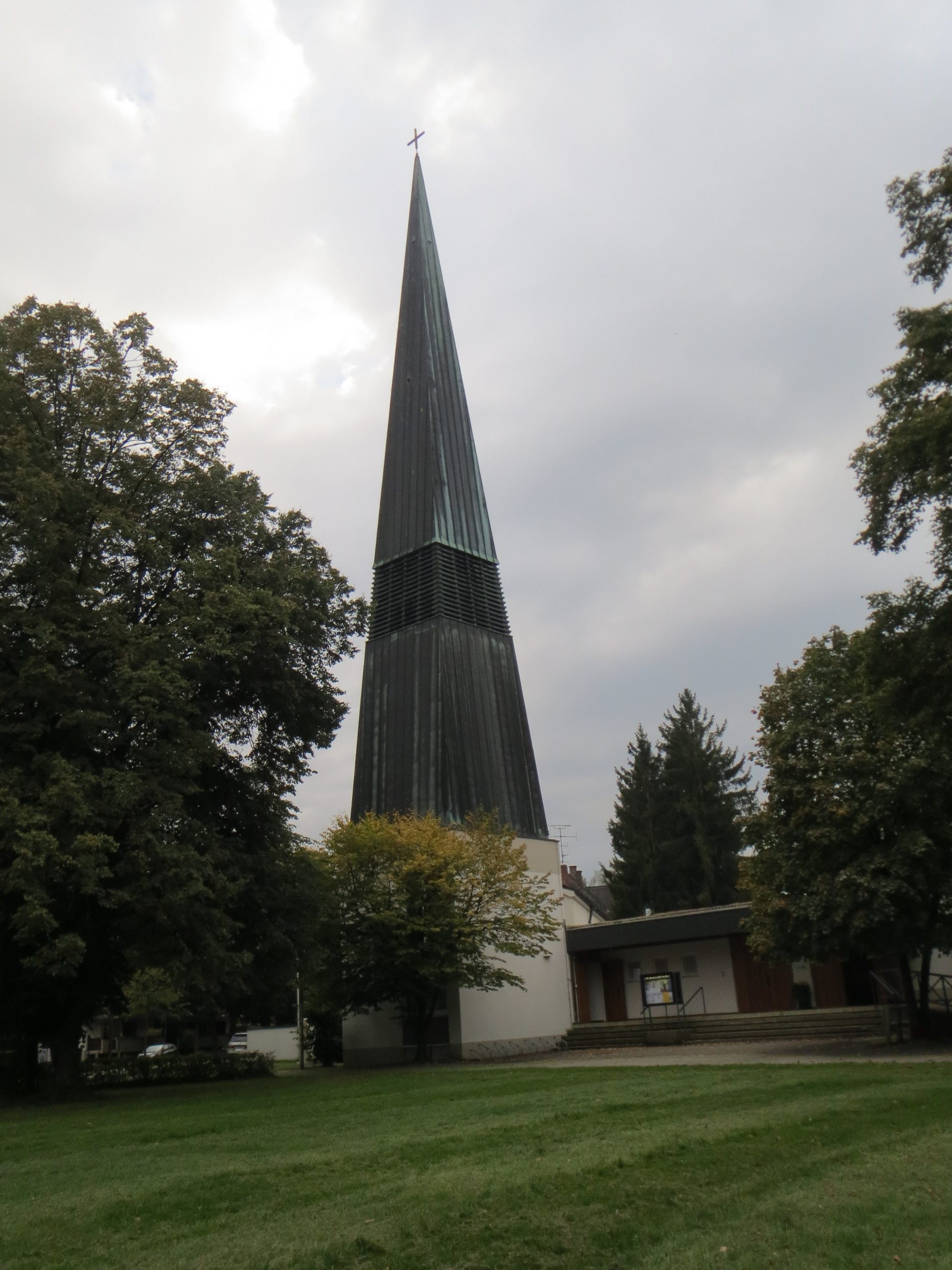 Den Kirchturm in der Heckenstallerstraße 104 kannst du schon von weitem gut sehen. Er ragt ganz schmal weit hinauf.