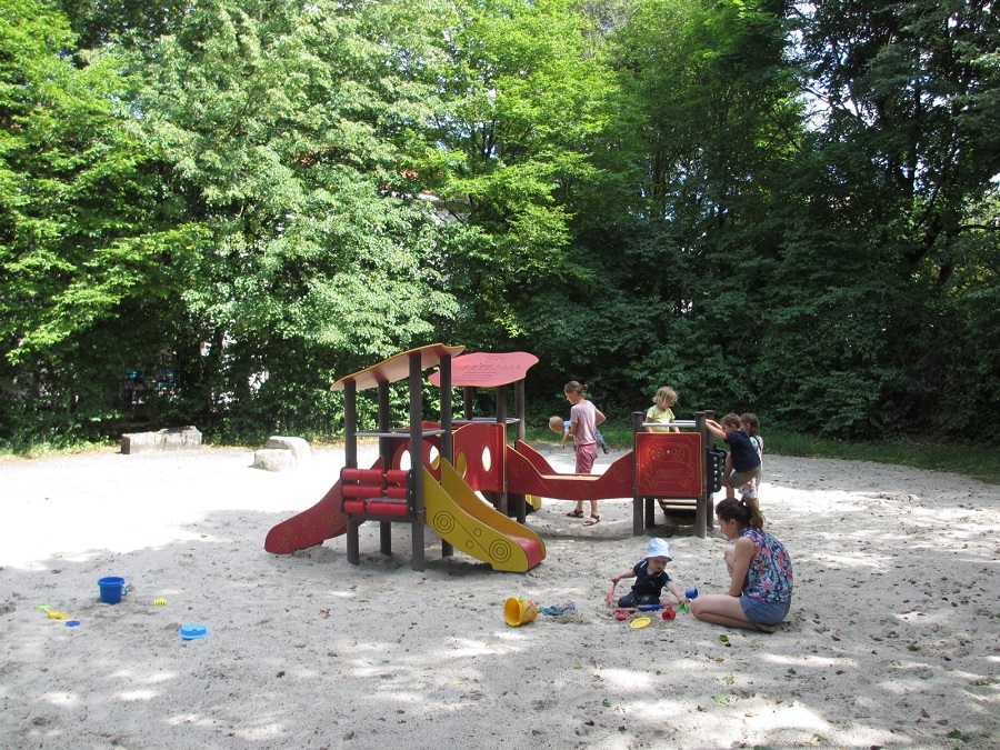Spielplatz gegenüber Attenkoferstraße 43 Beim Gottfried-Böhm-Ring gibt es einen Spielplatz, der eher etwas für Kleinkinder ist. Theresa (5) und Lukas (4). Hier findest du ein Miniklettergerüst mit einer Rutsche