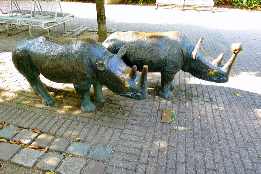 Die aus Bronze gefertigten Nashörner stehen im Fußgängerbereich im Arabellapark. Die über 1 Meter langen Nashörner spazieren neben den Fußgängern auf dem Weg.