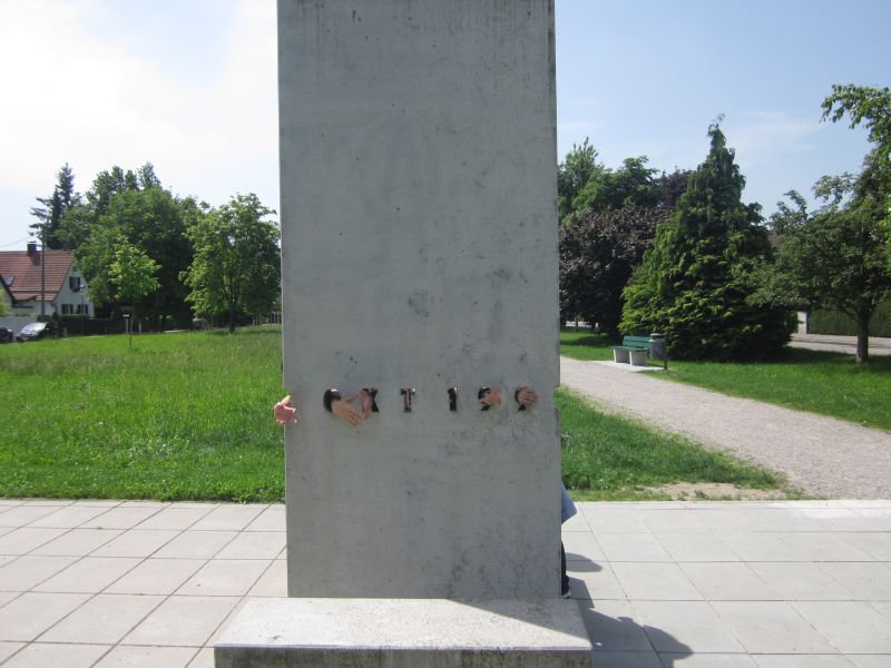 Das Denkmal zur Deutschen Einheit auf dem Platz Zur Deutschen Einheit. Die Stadtteilforscher stecken ihre Hände durch den Schriftzug. Außerdem findest du dort eine