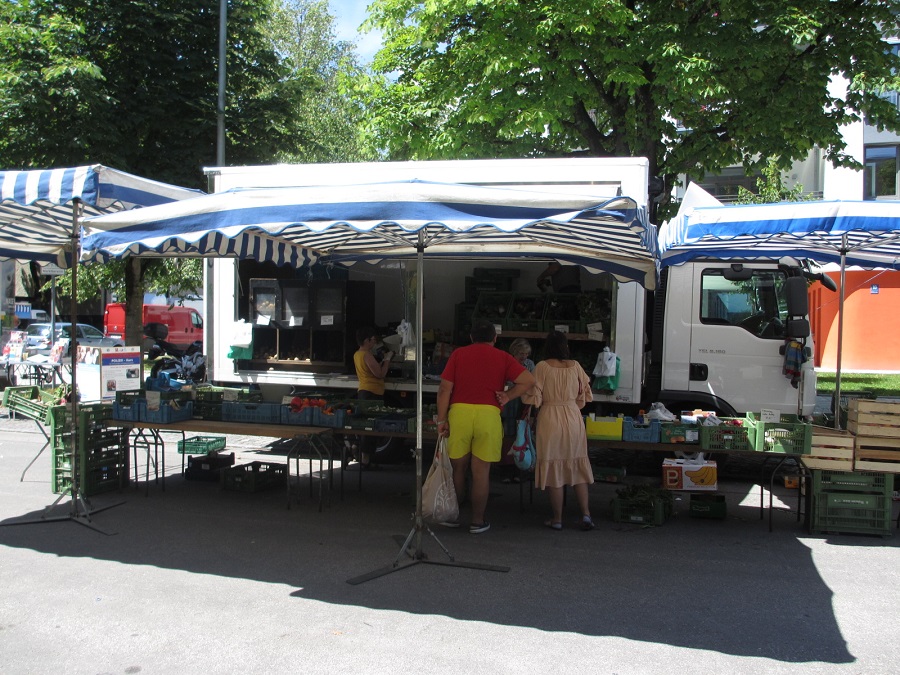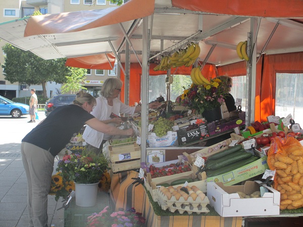 Auf dem Rotkreuzplatz findet jeden Donnerstag von 10 – 19 Uhr eine Wochenmarkt statt, wo es „viel Obst und Gemüse“ gibt (weswegen er für Dhana,