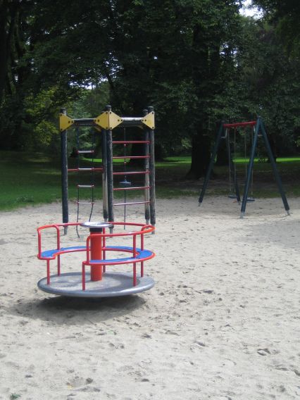 Der Spielplatz ist sehr groß und schön. Man kann auf einer großen Wiese Fußball spielen, auf einem großen Klettergerät herumklettern, es gibt schöne Schaukeln und