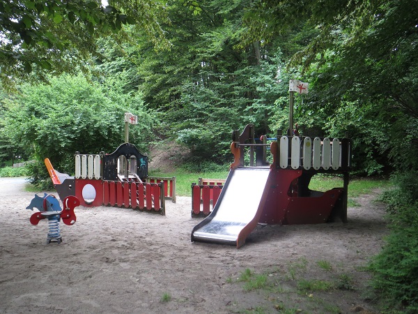 Das Besondere an diesem Spielplatz ist das Klettergerüst, das aussieht wie ein Schiff mit einem Bullauge zum Durchschauen, einem Rohr für den Ausguck, einer Hängebrücke