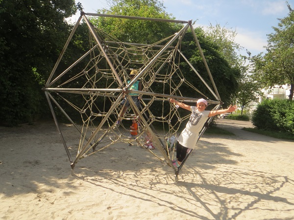 Schulkinder können auf dem Klettergerüstsehr gut Kletterfangen spielen. Da geht es rund zwischen Spinnennetz, Turnstange, dem blauen Netz und den zwei Brücken. Die Rutsche ist