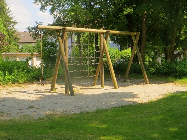 Auf dem Spielplatz ist für alle Kinder und Jugendlichen etwas geboten. Es gibt hier Reifenschaukeln, einen Trinkbrunnen, eine Rutsche mit Klettergerüst, ein Eisenseil zum Balancieren,