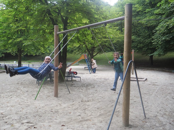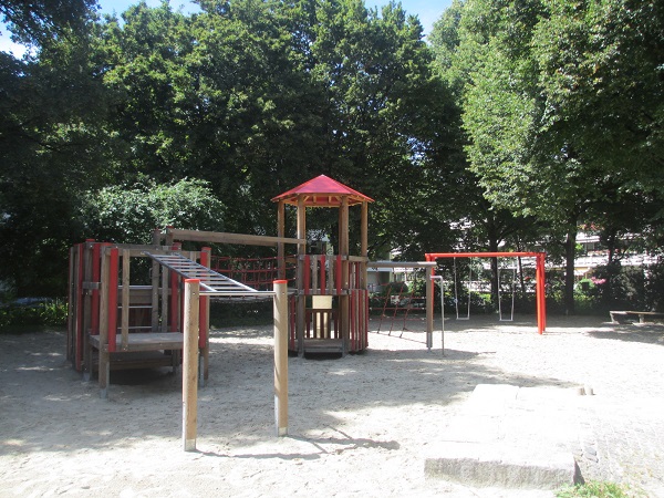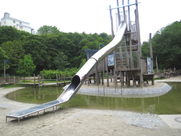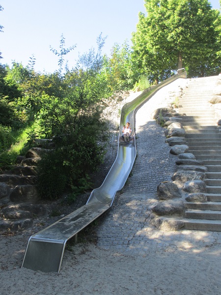Im Westteil des Parks gelegen, gleich an der Gilmstraße, ist ein toller Spielplatz mit Riesenrutschen, Hügeln und kleinem Wasserbecken. Melanie (10) zählt 40 Stufen, die