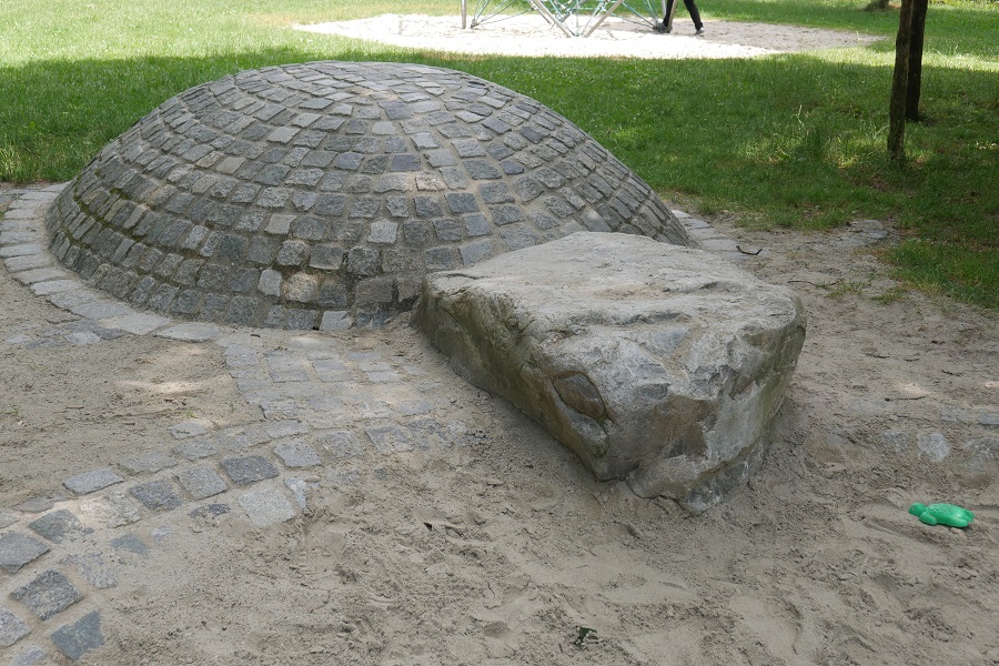Der Spielplatz ist zwar sehr groß, aber viele Geräte gibt es hier nicht: nur ein Seil-Klettergerüst und einen Sandkasten mit einer großen Steinschildkröte. Dafür kannst