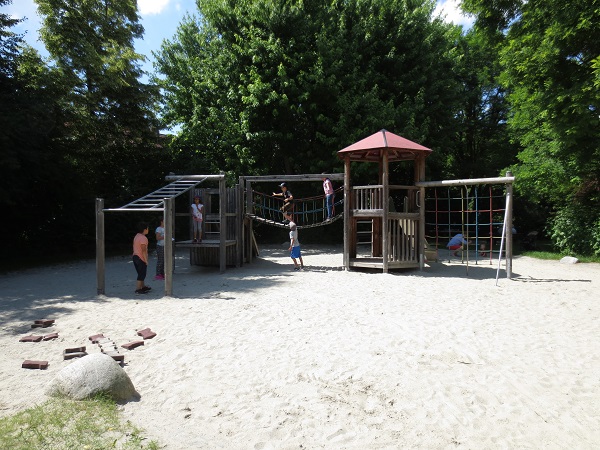 Das ist der große Spielplatz im Ostpark. Viele Bäume und Büsche sind rundherum. In den zwei kleinen Häuschen ist Wasser und Sand zum Spielen. Wasser
