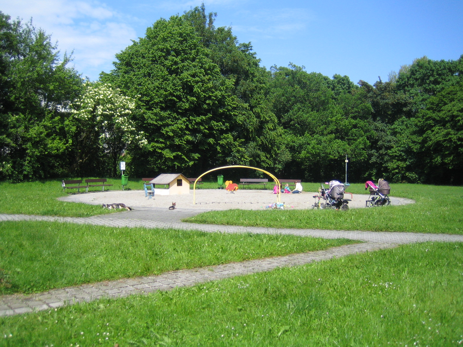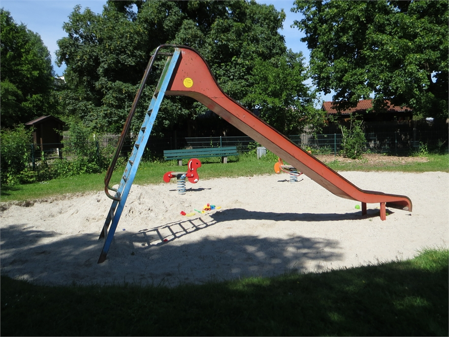 Der Kleinkinderspielplatz liegt direkt an der Radlstraße Dirschauerstraße. Er hat zwei Wipptiere, ein Spielhäuschen und einen Sandkasten. Es wird nicht mehr viel darauf gespielt, sagen