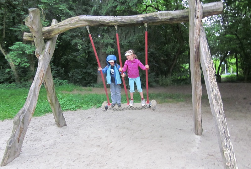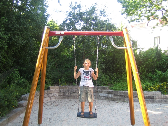Etwas im Gebüsch versteckt findest du einen Spielplatz mit zwei Schaukeltieren und einer Rutsche. Diese gefällt Mattiew (9) besonders gut, weil sie sehr steil und