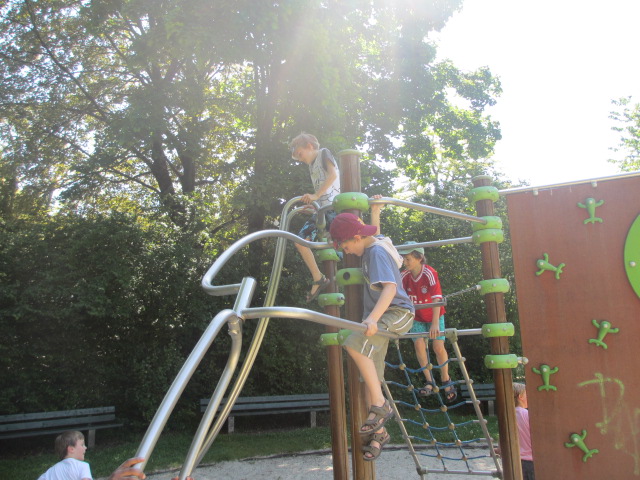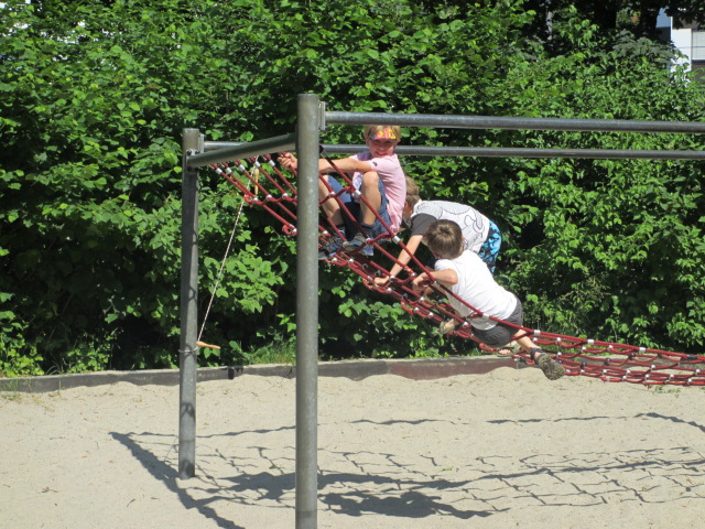 Größere Kinder gehen auf den Spielplatz im östlichen Teil des Zamilaparks. Von der Kletterwand kann man sich an Ringen entlang hangeln zu einem Spielgerät mit