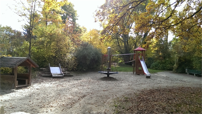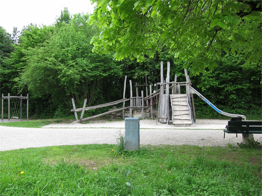 Der sogenannte Storchenspielplatz ist für Kleinkinder gut geeignet. Es gibt dort eine Vogelrutsche, zwei Spielhäuschen und eine Spiralwippe. Die Bank mit den Steinvögeln, einem Geier,