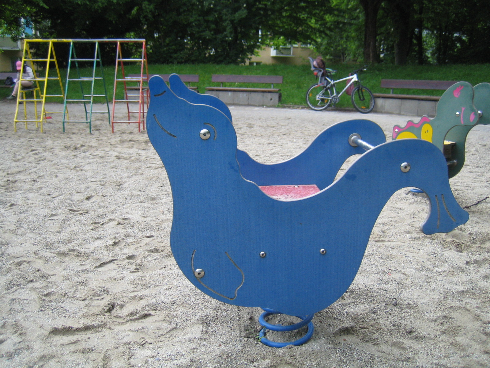 Der Kleinkinderspielplatz hat eine Wippe, ein Klettergerüst und ein Wackeltier.