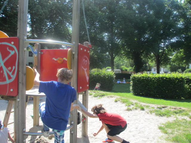 Dieser Spielplatz liegt zwischen den Schrebergärten. Auf dem Schild am Tor zum Schrebergartenspielplatz steht, dass man auf Kleinkinder besonders achten soll. Fußball oder ähnliche Spiele,