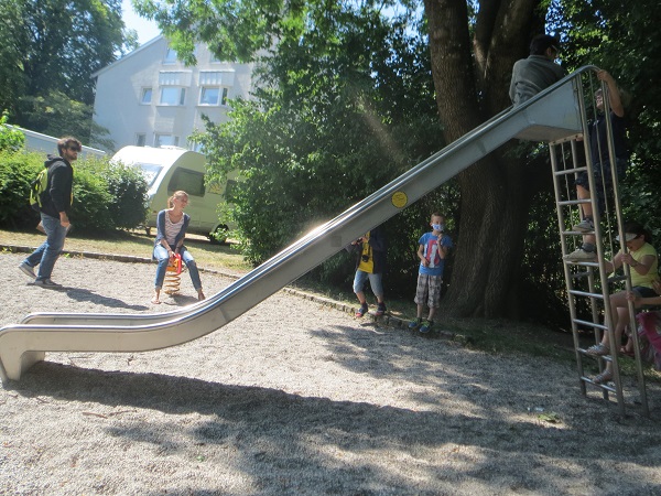 In der Nähe der Leutweinstraße und Bernatzikstraße ist der Zamilapark. Die Stadtteilforscher fanden das Spielhäuschen und die Wippe für ganz Kleine in Ordnung.