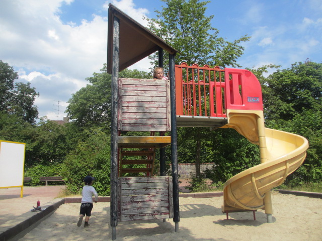 Ein schattiger Spielplatz am Scherfweg. Das Spielhaus mit Rutsche und Kletternetz ist für kleinere Kinder toll zum Spielen. Den Kletterpfahl fanden die Stadtteilforscher aus