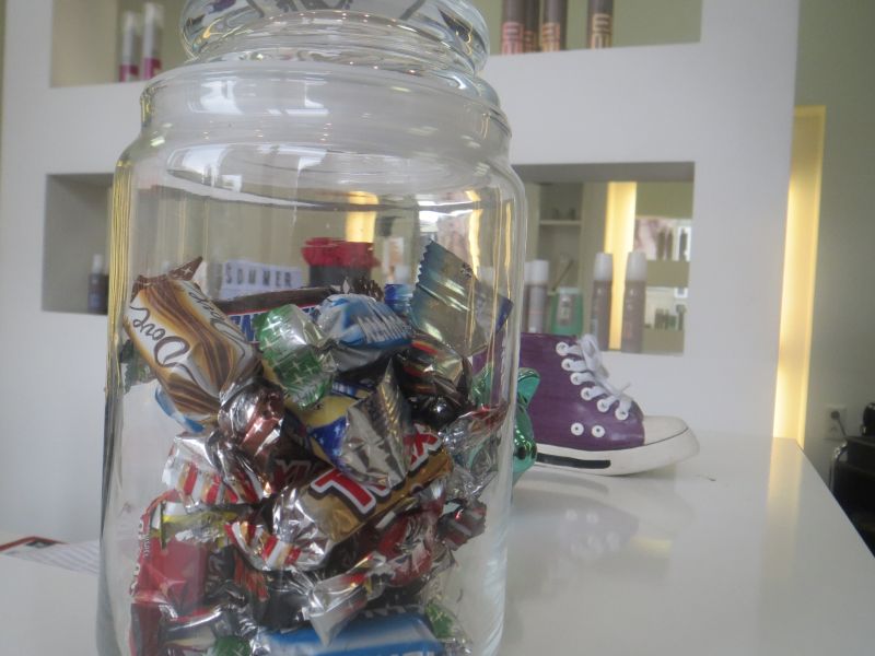 Wo steht das Bonbonglas? a) Bei einem Friseur. b) Bei einem Zahnarzt. c) In einem Süßigkeitenladen.