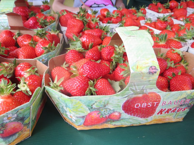 Hier kannst du an einem lustigen Stand, der wie eine große Erdbeere aussieht, leckere Erdbeeren kaufen. Die nette Verkäuferin hat Nikoleta (10), Wiktoria (10), Zahraa