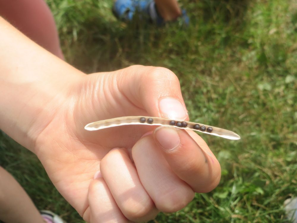 Auf den Feldern wachsen Mais und Raps. Wir haben auch Mohn, Löwenzahn und eine Johannisbeerhecke gefunden. An den Feldern gehen wir entlang oder fahren mit