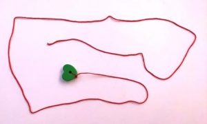 Als erstes nimmst du den dicken Faden und schneidest ein 1 m langes Stück davon ab. Dann bindest du deine Perle an einem Ende mit einem Doppelknoten fest.