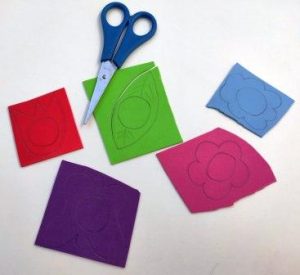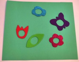 Im nächsten Schritt malst du auf deine Moosgummistücke große Blumen, Blätter, Wolken und was sonst noch so auf eine Blumenwiese passt.