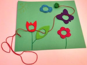 Nimm nun die Schnur mit der Perle und fange an, die Perle nacheinander durch alle Löcher in den Blumen und Blättern zu fädeln. Dabei ist die Reihenfolge egal. Pass auf, dass das andere Ende der Schnur nicht wieder aus einem der Löcher heraus rutscht. Wenn der Faden durch alle Löcher gefädelt wurde, hast du es geschafft. |