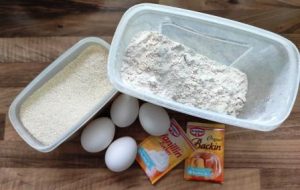 Für den Teig Eiweiß und Eigelb voneinander trennen und jeweils in eine eigene Schüssel geben. Das Eiweiß musst du als erstes steif schlagen. (So lange rühren bis ihr die Schüssel umdrehen könnt ohne das das Eiweiß heraus läuft 🙂 Dann gebt ihr zu dem Eigelb in die Schüssel noch den Zucker und Vanille-Zucker. Ihr rührt das ganze so lange bis es schön cremig aussieht. Dann gebt ihr das Mehl und das Backpulver dazu und verrührt noch einmal alles miteinander. Nun gebt ihr das geschlagene Eiweiß mit einem Löffel dazu und rührt das Eiweiß langsam unter den Rest des Teiges.