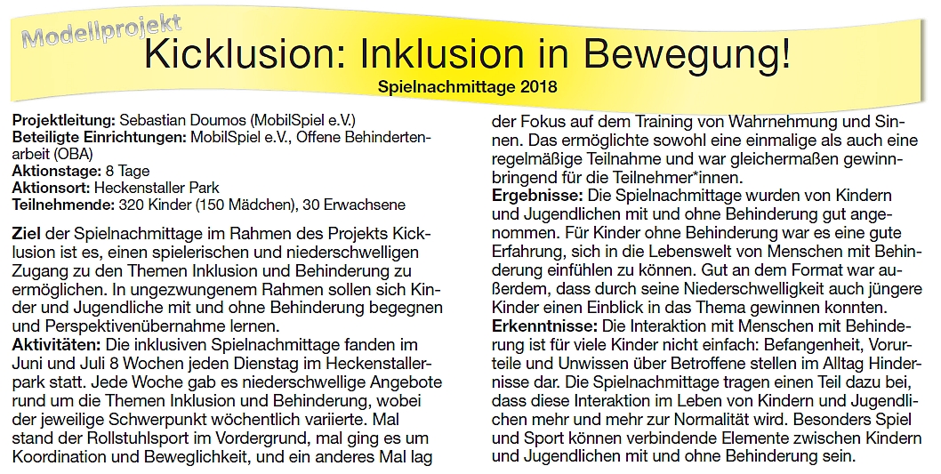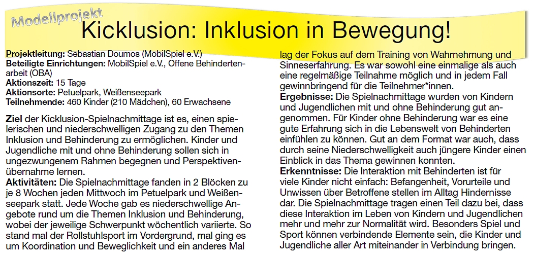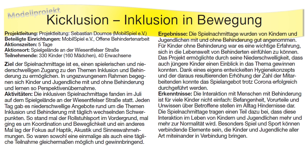 Ergebnisse 2021: Die Spielnachmittage wurden von Kindern und Jugendlichen mit und ohne Behinderung gut angenommen. Für Kinder ohne Behinderung war es eine gute Erfahrung sich in die Lebenswelt von Behinderten einfühlen zu können. Durch seine Niederschwelligkeit konnten auch jüngere Kinder einen Einblick in das Thema gewinnen. Dank eines guten Hygienekonzepts und erhöhter Mitarbeiter*innenzahl konnte das Spielangebot trotz Corona erfolgreich durchgeführt werden.