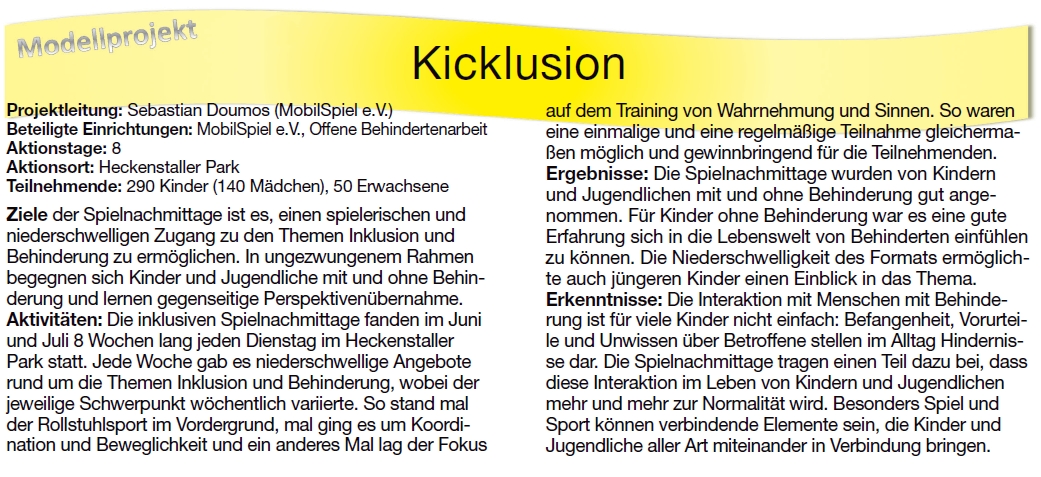 Erkenntnisse: Die Interaktion mit Behinderten ist für viele Kinder nicht einfach: Befangenheit, Vorurteile und Unwissen über Betroffene stellen im Alltag Hindernisse dar. Die Spielnachmittage tragen dazu bei, diese Interaktion im Leben von Kindern und Jugendlichen mehr und mehr zur Normalität werden zu las-sen. Besonders Spiel und Sport können Kinder und Jugendliche aller Art miteinander in Verbindung bringen.