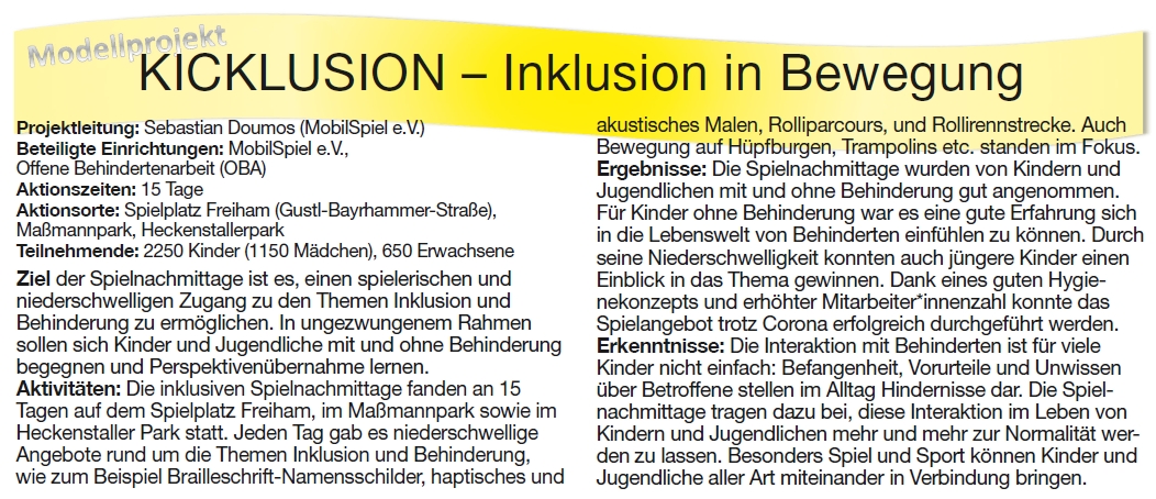 Aktivitäten 2021:Die inklusiven Spielnachmittage fanden an 15 Tagen auf dem Spielplatz Freiham, im Maßmannpark sowie im Heckenstaller Park statt. Jeden Tag gab es niederschwellige Angebote rund um die Themen Inklusion und Behinderung, wie zum Beispiel Brailleschrift-Namensschilder, haptisches und akustisches Malen, Rolliparcours, und Rollirennstrecke. Auch Bewegung auf Hüpfburgen, Trampolins etc. standen im Fokus.