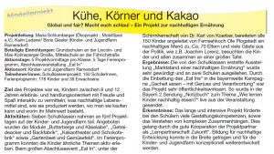 Was ist eigentlich im Essen drin und wie kommt es überhaupt zu uns in den Supermarkt? „Kühe, Körner und Kakao“ ist ein Ernährungsprojekt für Klassen mit 6 bis 12-Jährigen im Rahmen der Lernpartnerschaft Zukunft. Dabei lernen Kinder woher ihre Lebensmittel kommen,