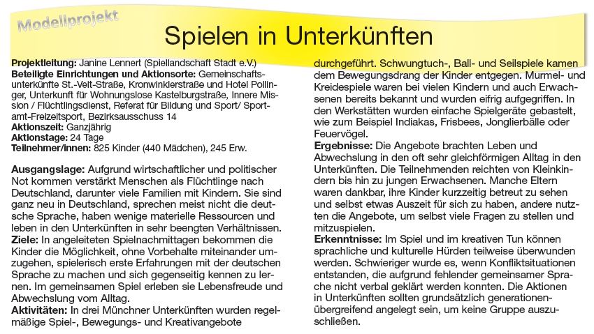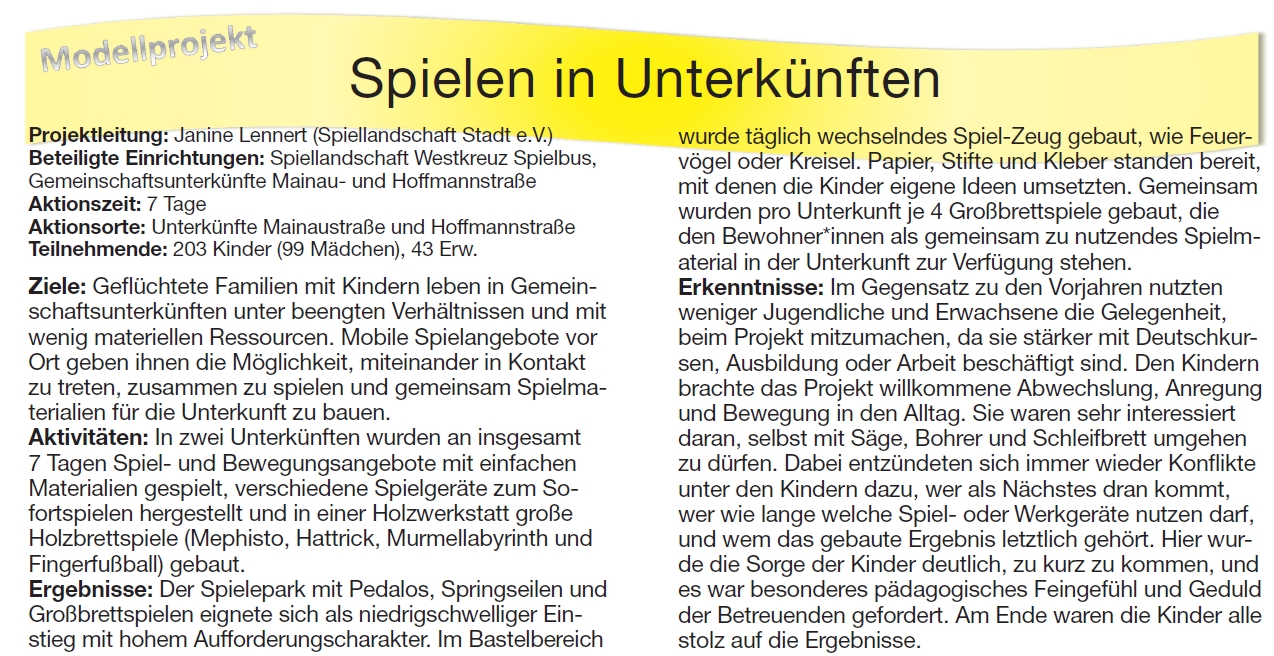 Bereits seit den neunziger Jahren organisieren Spielmobile spiel- und kulturpädagogische Angebote in Unterkünften. Aus aktuellem Anlass wurde das Thema ab 2014 auch erneut als Modellprojekt der AG Spiellandschaft Stadt initiiert.