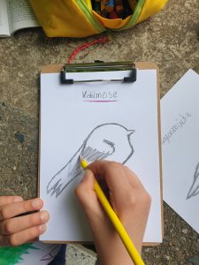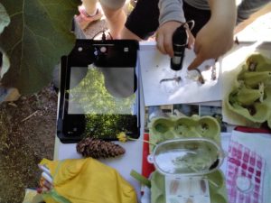 Erkenntnisse: Natur bietet vielfache haptische, optische, olfaktorische und akustische Reize. Durch digitale Medien werden Naturerlebnisse und -entdeckungen (mit-)teilbar. Kinder freuen sich, Kenntnisse aus dem Schulunterricht wie Baumarten und Blattformen mitzubringen. Das Bestimmen im Wald ist ganz anders als auf Arbeitsblättern und weckt den Forschergeist. Immer wieder gilt es, etwas noch nicht Bekanntes zu bestimmen und den anderen dieses Neue mitzuteilen. Kinder bringen viel Wissen mit, jedoch auch Ideen wie die, dass Papier aus Blättern vom Baum gemacht wird. Der Austausch in neugieriger und forschender Form motiviert, sich einzubringen und Neues aufzunehmen. Die Bestimmung von Vogelstimmen war spannend und die Kinder gaben sich große Mühe, „ihre“ Vögel aus Büchern möglichst genau abzuzeichnen, um anderen Kindern die Erzeuger der Vogelgeräuscheaufnahmen auch zeigen zu können. Apps und Bestimmungsbücher motivierten zum Kennenlernen von Tieren und Pflanzen. Das Erforschen und Festhalten von Mikrowelten mit der Mikroskopkamera begeisterte Kinder und Erwachsene gleichermaßen.