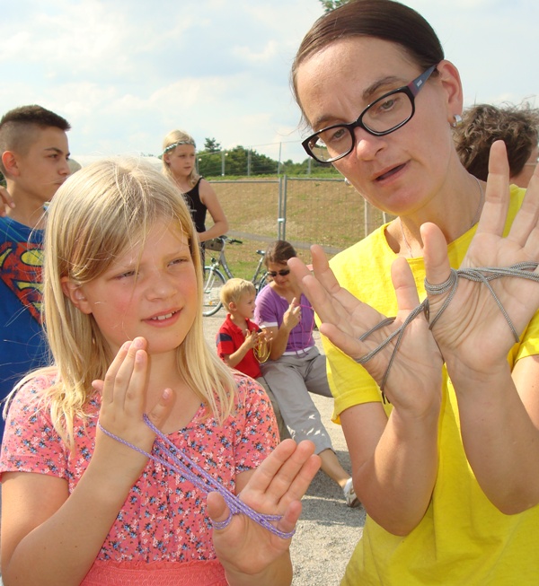 Vom Fadenspiel sind Menschen aller Generationen begeistert, hier kommen Kulturen zusammen und oft lernen auch die Anleiterinnen im Projekt von den Besuchern wieder neue Figuren oder auch Namen: so heißt ein und dieselbe Figur in Japan zum Beispiel Besen, im hohen Norden Fischspeer, und wir nennen sie Fallschirm.