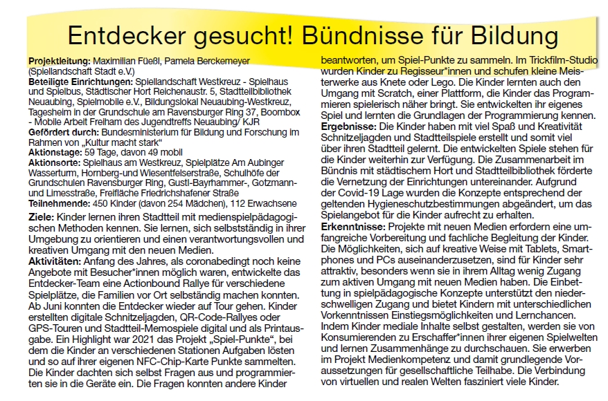 Neue Projekte und Ideen stehen seit 2013 Jahr im Fokus des Bündnisprojekts „Entdecker*innen gesucht“ im Stadtteil Westkreuz-Neuaubing-Freiham. Das Projekt wird auch 2022 fortgesetzt werden.