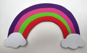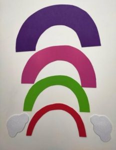 Danach schneidest du die anderen Bögen aus dem Tonpapier aus und klebst sie aufeinander. Die Wolken kommen am Schluss noch an die beiden Enden des Regenbogens.